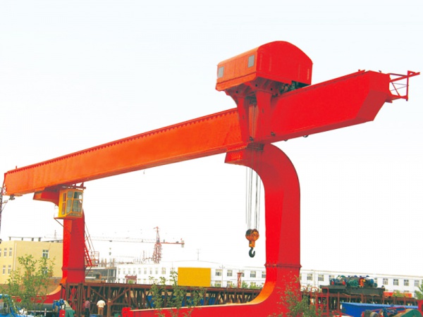 门架为箱形单主梁两支腿结构,起重量20t以下时小车采用垂直反滚轮式,大于20t时小车采用水平反滚轮式,在主梁一侧运行。主梁采用单梁偏轨形式,支腿与下横梁组成L型,支腿两侧一般均带有悬臂,吊运物品时过跨能力强,便于将物件从跨内转运到悬臂下。小车为侧面悬挂方式,吊具布置在主梁侧面,起重量≤20t时采用垂直反滚轮二支点形式,起重量>20t时采用水平反滚轮三支点形式。