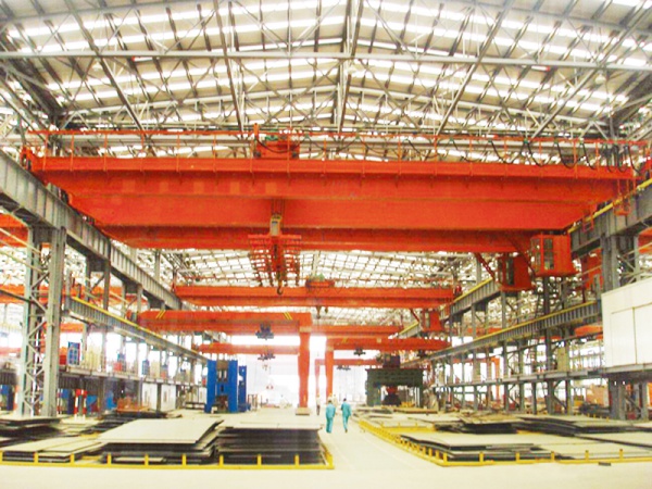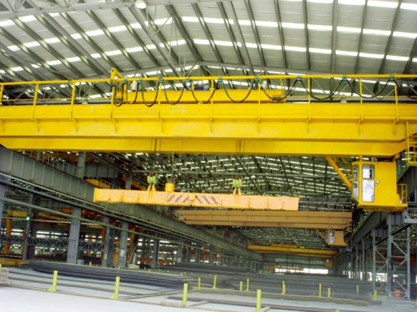 本起重机采用挂梁吊运长件钢坯、板材、棒材、盘圆等物品,配置电磁吸盘或夹钳或其它群钩进行吊装,主要由箱形桥架、起重小车、大车运行机构、司机室和电气控制系统组成,配有停电保磁系统。起升机构多采用单电机、双减速器、双卷筒布置,呈双吊点形式。挂梁布置形式分垂直于主梁或平行于主梁两种。其余形式与QD型起重机相同。
