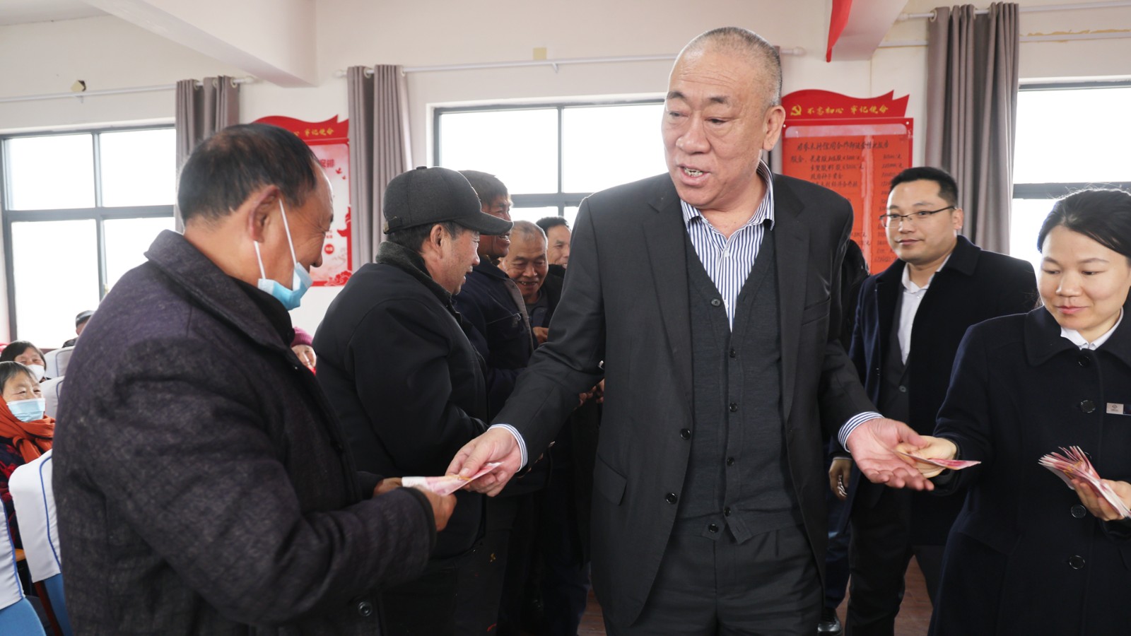 ▲崔培军书记为每位老人发500元慰问金及10斤猪肉
